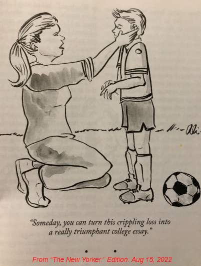 The August 15, 2022 edition of The New Yorker has a comic of a sad child who has apparently lost a soccer match, and the mother was trying to comfort him. The caption reads, “Someday, you will turn this crippling loss into a really triumphant college essay.” This caption epitomizes what is called the “trauma essay” where students write about failure or sad stories from their lives.